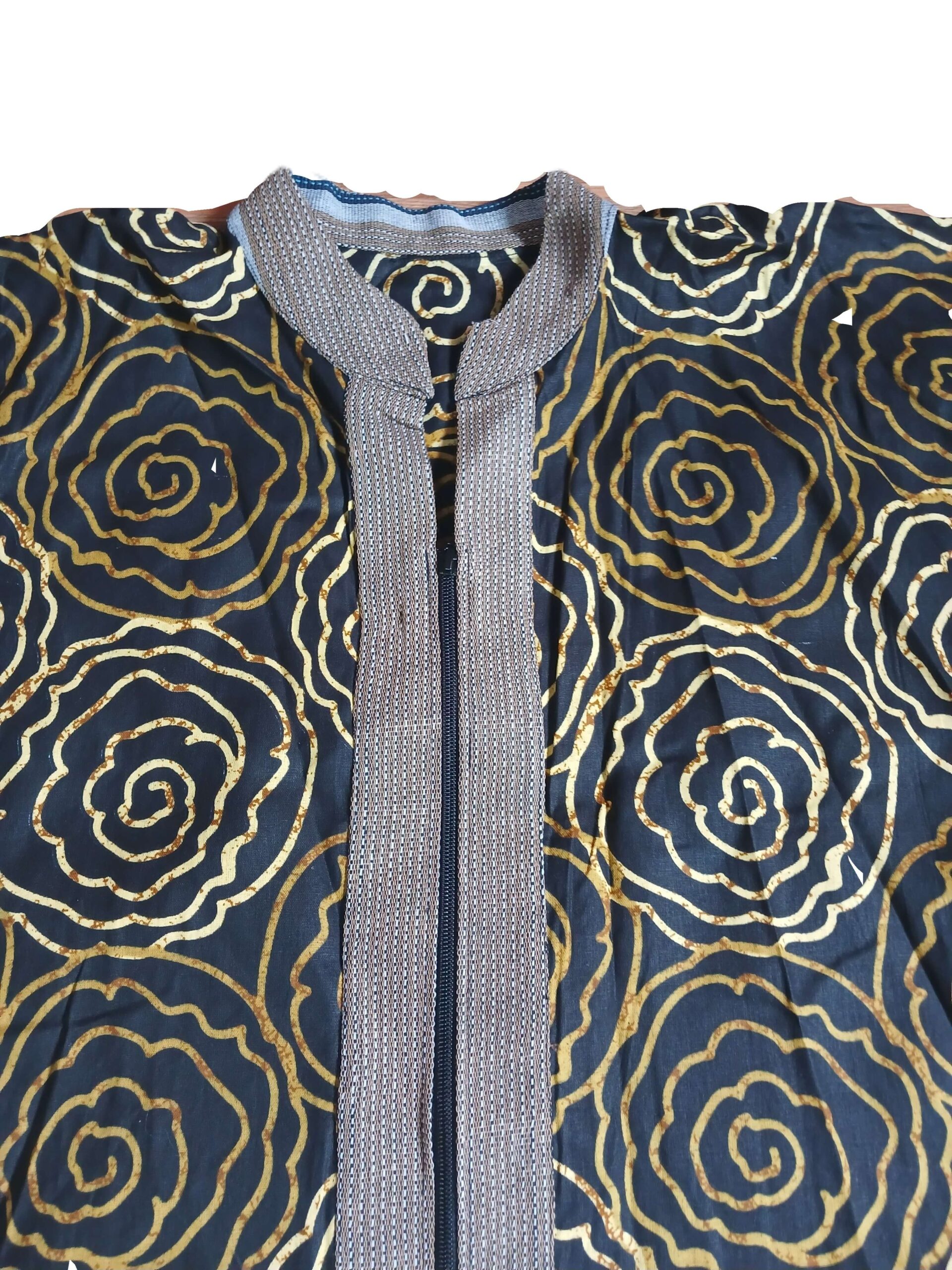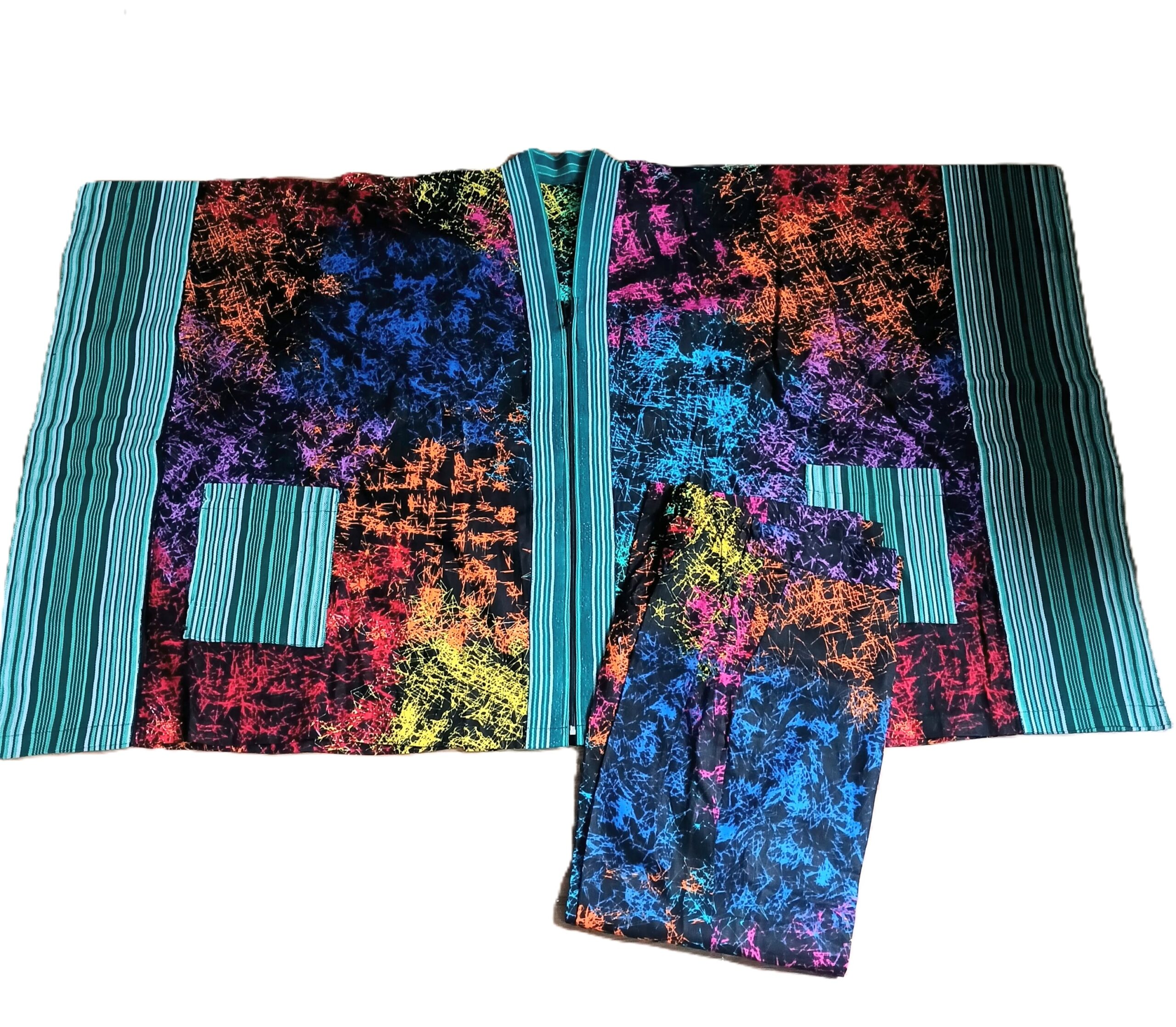The generous, flowing kimono and the matching tailored trousers are made from premium 100% Cotton Ankara, ensuring breathability and a beautiful drape. The deep, rich texture of the Aso-Oke detailing—carefully integrated along the lapels and edges—highlights the quality and artistry of this piece.