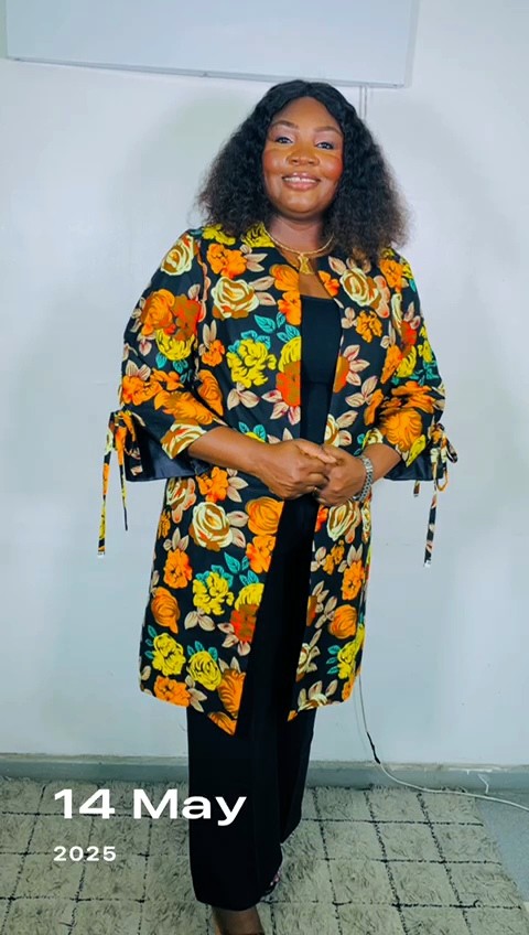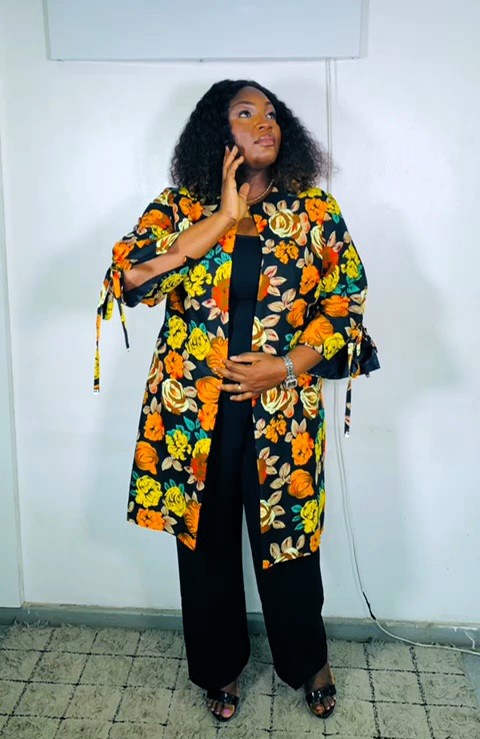 A colourful, mid-length Ankara kimono with full inner lining , two side pockets and short bell sleeves.