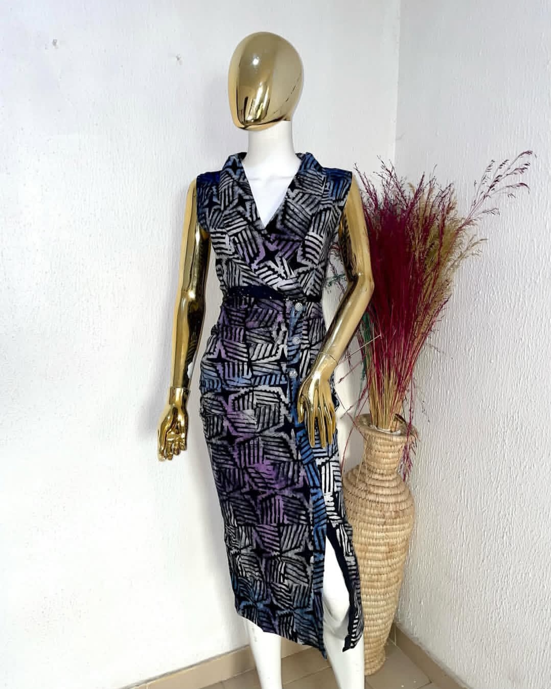 Adunni is a sassy Adire Dress tailored to fit the confident woman. She is sleeveless and features a stylish wide collar with a knee-high slit. Show off your clean silhouette and walk tall in the sassy Adire dress.