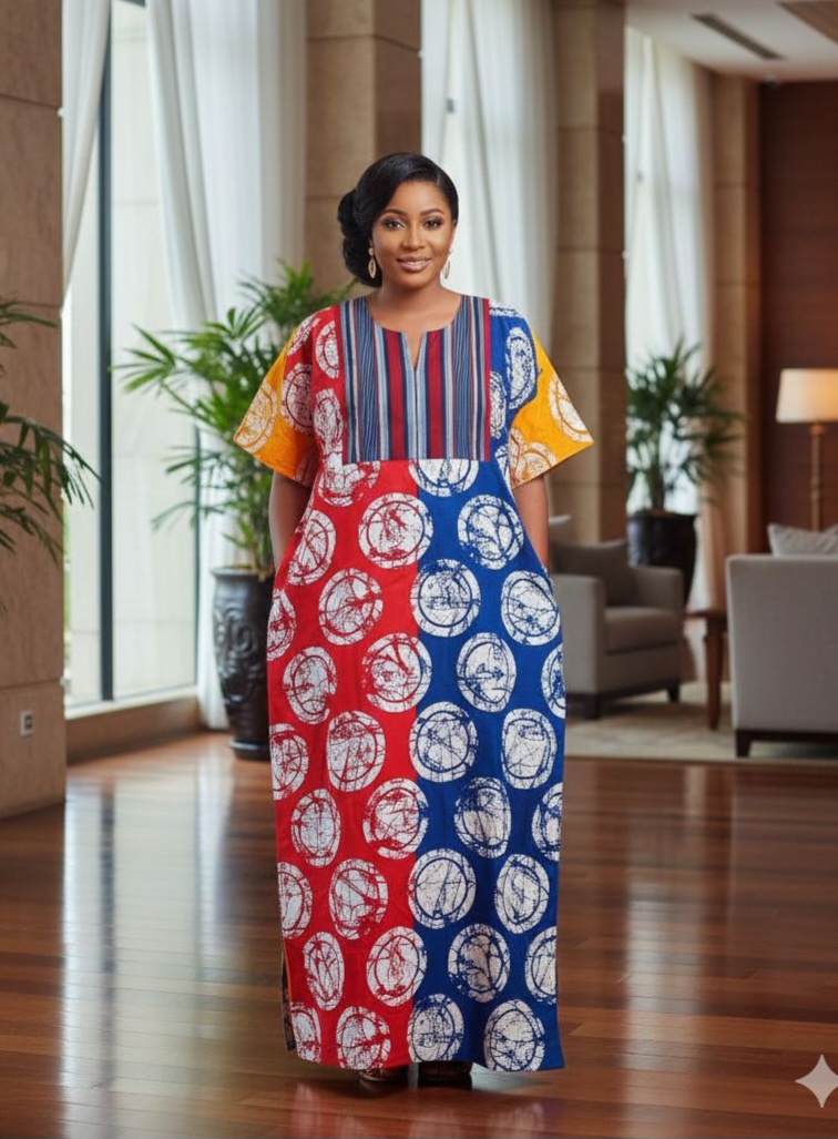 Step out in unapologetic style with our SOLA Ankara Kaftan Boubou! This charming piece is designed for effortless comfort and made from a vibrant print featuring blue, red, and yellow swatches. Also making a statement with Aso-oke bib detail, SOLA creates a look that’s both sweet and sophisticated.